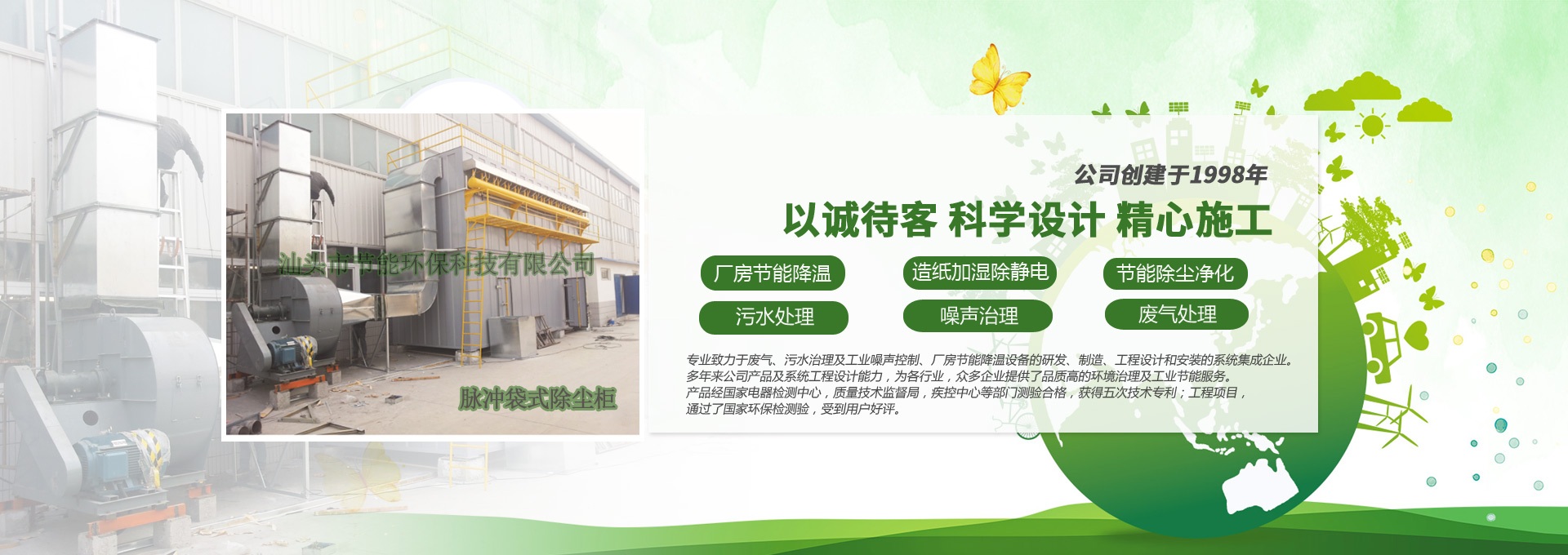 汕頭市節(jié)能環(huán)保科技有限公司創(chuàng)建于1998年,是一家專業(yè)致力于廢氣、污水、粉塵、噪聲治理,廠房節(jié)能降溫設(shè)備的研發(fā)、制造、工程設(shè)計(jì)和安裝的系統(tǒng)集成企業(yè)。多年來(lái)公司產(chǎn)品及系統(tǒng)工程設(shè)計(jì)能力,為各行業(yè),眾多企業(yè)提供了品質(zhì)高的環(huán)境治理及工業(yè)節(jié)能服務(wù)。產(chǎn)品經(jīng)國(guó)家電器檢測(cè)中心,質(zhì)量技術(shù)監(jiān)督局,疾控中心等部門(mén)測(cè)驗(yàn)合格,獲得五次技術(shù)專利;工程項(xiàng)目通過(guò)了國(guó)家環(huán)保檢驗(yàn)檢測(cè),受到用戶好評(píng)。